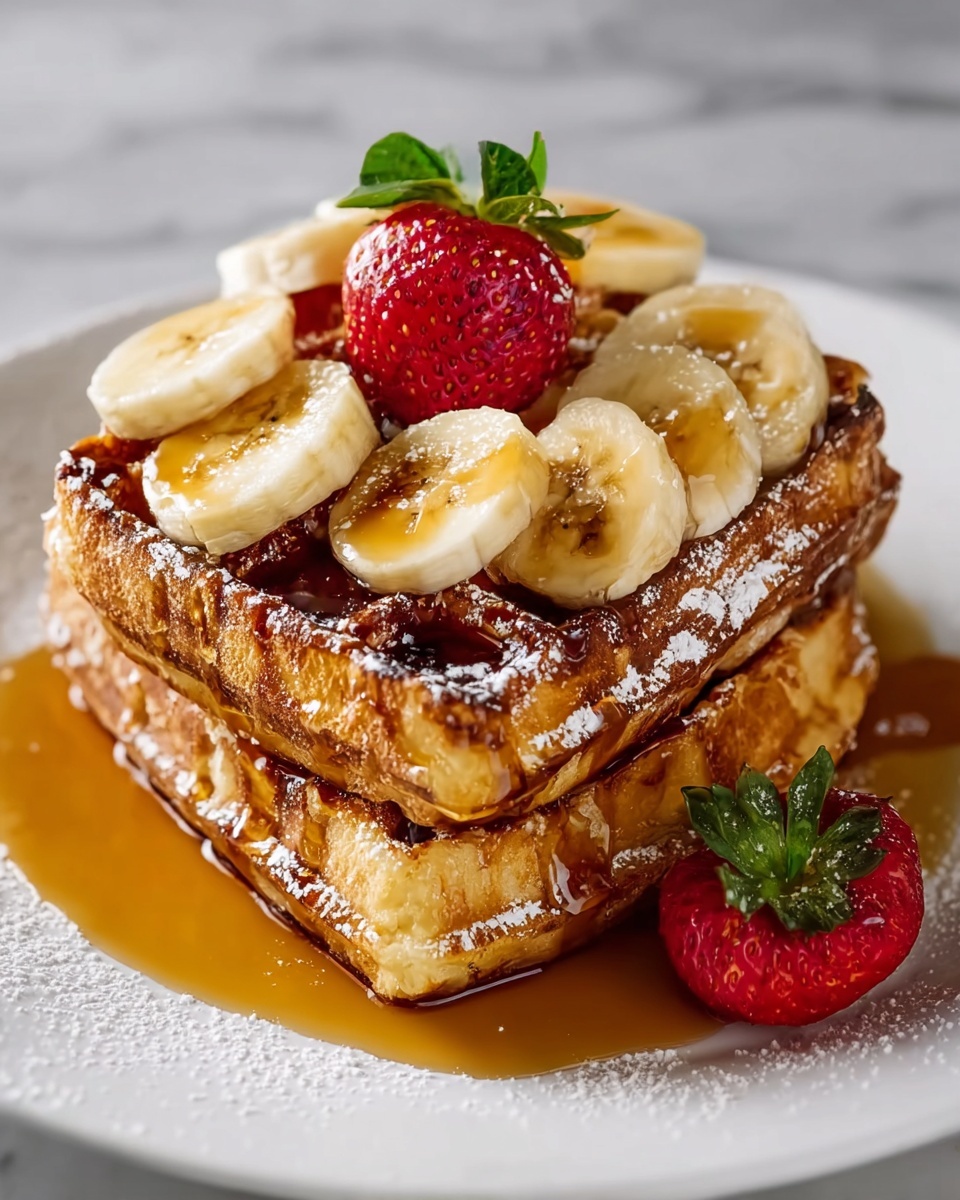 Serve this waffle French toast with a side of crisp bacon or sausage for a savory contrast. Fresh fruit salad or tropical fruit like mango and pineapple pairs beautifully, balancing sweetness with refreshing juiciness.