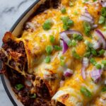 Sprinkle two tablespoons of shredded cheddar cheese over the beef on each tortilla. The cheese melts during baking, helping everything stick together and taste extra indulgent. Tightly roll each tortilla so the filling stays snug inside without spilling out.
