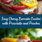 This Cheesy Burrata Crostini with Prosciutto and Peaches is a delightful appetizer featuring crispy toasted baguette topped with creamy burrata cheese, savory prosciutto, sweet fresh peaches, and a tangy balsamic glaze, finished with fragrant fresh basil. Perfect for a quick and elegant snack or party starter.