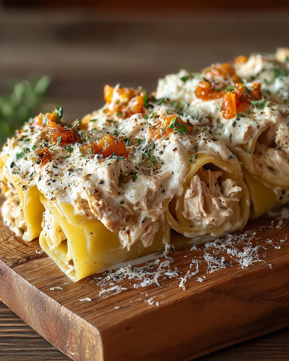 - Assemble Rolls: Preheat the oven to 375°F (190°C). Spread a thin layer of Alfredo sauce on the bottom of a baking dish to prevent sticking. Place one cooked lasagna noodle on a flat surface, spread approximately 2 to 3 tablespoons of the chicken-cheese mixture evenly along the noodle, then tightly roll it up. Place the rolled noodle seam-side down in the prepared baking dish. Repeat these steps for all noodles and filling.