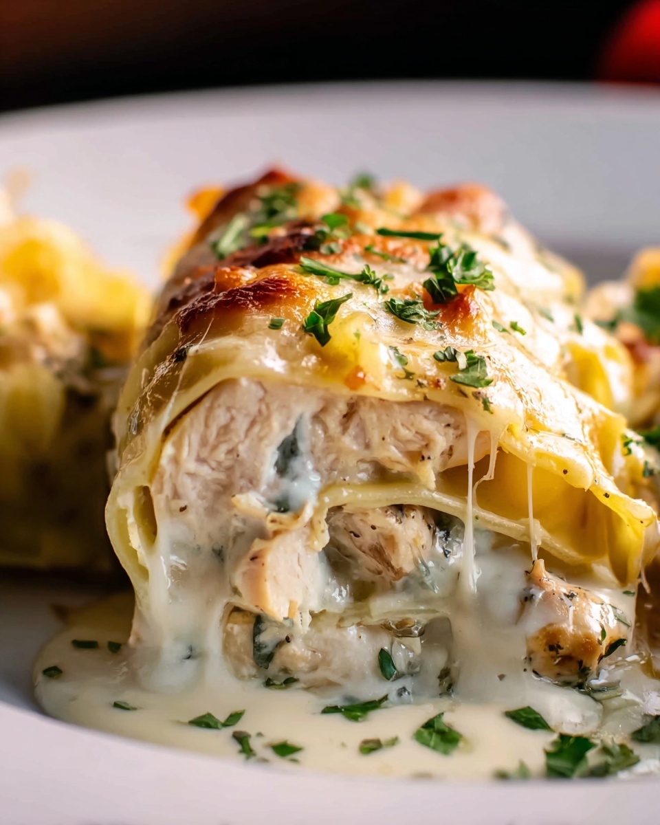 - Assemble the Roll-Ups: Preheat your oven to 375°F (190°C). Spread a thin layer of Alfredo sauce on the bottom of a 9×13-inch baking dish to prevent sticking. Lay each cooked lasagna noodle flat on a clean surface, spoon the chicken mixture along the center of each noodle, then carefully roll up the noodles and place them seam-side down in the prepared baking dish.