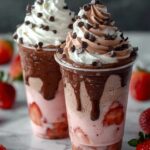 This Chocolate Strawberry Frappuccino is a deliciously creamy and refreshing beverage perfect for a quick pick-me-up. Combining the natural sweetness of fresh strawberries, the rich flavor of chocolate syrup, and the energizing touch of brewed coffee, this easy-to-make frappuccino can be customized with dairy or non-dairy milk options. Topped with whipped cream and garnished with chocolate drizzle and strawberry slices, it delivers a delightful balance of fruity and chocolaty flavors.