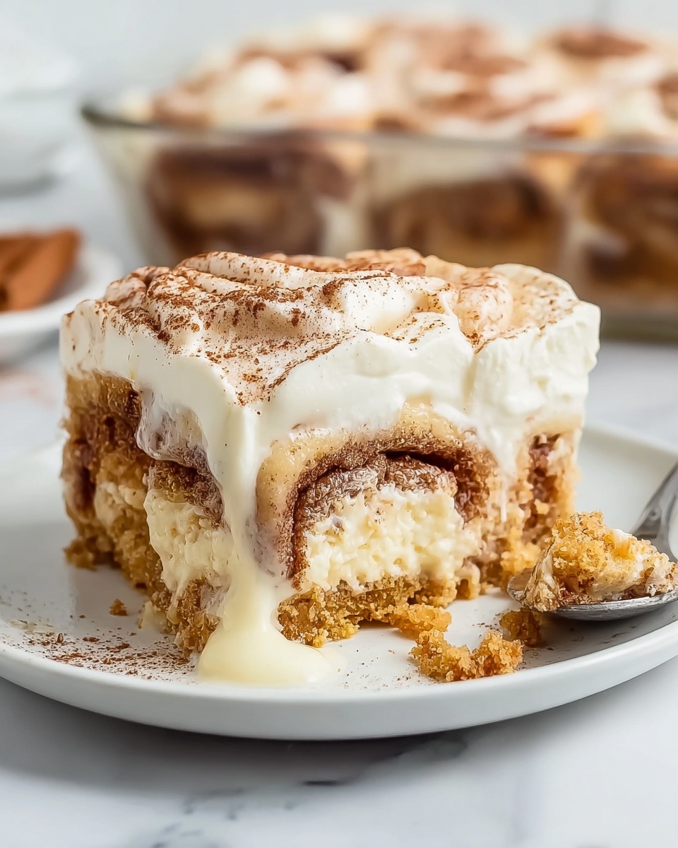 For a fun twist, serve this poke cake in individual mason jars layered with extra frosting and cinnamon crunch topping. Or turn it into a trifle by alternating cake cubes with whipped cream and fruit. You can also cut it into bite-sized bars for easy sharing at parties or pack it in lunchboxes for a special treat that keeps the Cinnamon Roll Poke Cake Recipe’s charm alive anywhere.