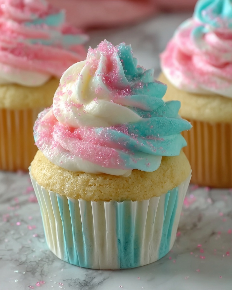 While the cupcakes cool completely (a must before frosting), prepare the buttercream. Beat the softened butter until smooth, then gradually add powdered sugar, beating well between additions. Add the cotton candy flavoring and a couple of tablespoons of heavy cream or milk, mixing until you reach a luscious, creamy consistency perfect for piping or spreading. Tint the frosting pink and blue in separate bowls to coordinate with the cupcake colors.