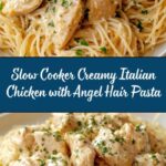 Crockpot Angel Chicken is a creamy, flavorful slow-cooked chicken dish made with a rich blend of cream cheese, butter, cream of chicken soup, Italian dressing mix, and garlic. Perfectly tender and juicy, this comforting meal is served over angel hair pasta for a satisfying family dinner.