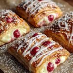 This Easy Cherry Danish Pastry recipe features buttery puff pastry triangles filled with smooth cream cheese and sweet cherry pie filling. Lightly brushed with egg wash for a golden finish and dusted with powdered sugar, these pastries are perfect for breakfast, brunch, or an elegant dessert. The recipe is straightforward and yields 12 delightful pastries with a crisp, flaky texture and rich, fruity flavor.