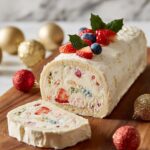 9. Garnish: Decorate with fresh rosemary sprigs and cranberries around and on top of the log to enhance the festive appearance.