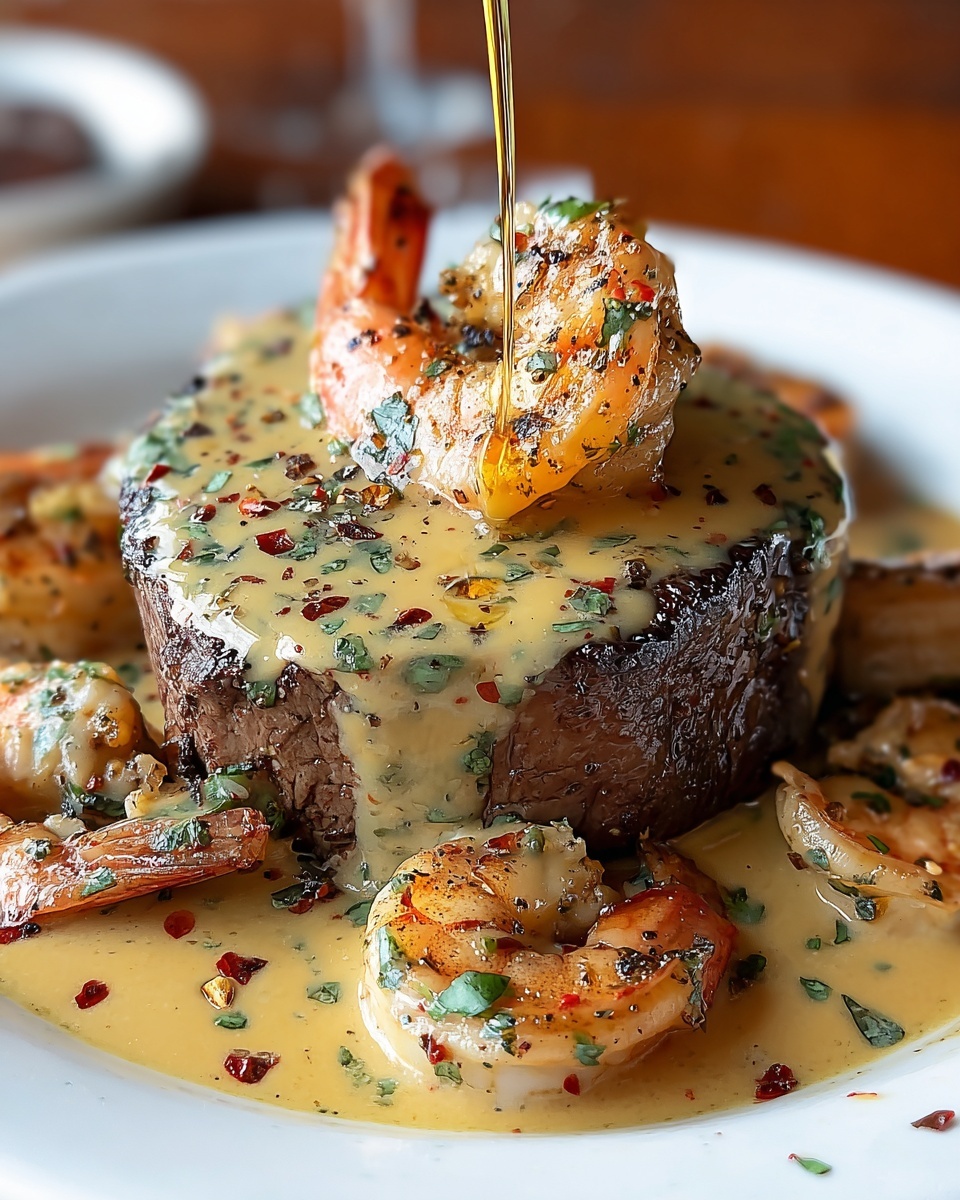 A luxurious and elegant dish featuring tender filet mignon steaks topped with succulent shrimp and lobster in a rich, creamy sauce. Perfect for special occasions or a gourmet dinner at home.