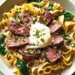 This Garlic Butter Steak with Egg Noodles and Spinach Salad is a flavorful, quick-to-make dinner perfect for weeknights. Tender sirloin steak slices are cooked to perfection in a savory garlic butter sauce and tossed with al dente egg noodles. Served alongside a fresh, vibrant spinach salad dressed with tangy balsamic vinaigrette, this dish balances richness with freshness for a satisfying and well-rounded meal.
