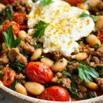 This hearty Greek Sausage and Beans recipe combines tender butter beans or gigantes with flavorful Italian sausage, fresh vegetables, and aromatic herbs. Slow-baked to perfection with cherry tomatoes and a tangy feta topping, it makes a comforting and satisfying meal for any occasion.