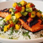 - Serve: Plate a portion of the coconut rice, top with a grilled salmon fillet, and generously spoon avocado-mango salsa over the top. Serve immediately and enjoy the vibrant flavors.