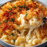 Spread the remaining lobster chunks across the top of the pasta mixture for extra pops of flavor. Sprinkle on the remaining shredded cheese and then a generous layer of panko crumbs mixed with melted butter, which will crisp beautifully in the oven. Bake the entire dish for 30 minutes at 375°F (190°C), until it’s bubbling and golden brown on top.