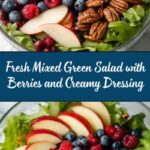 A vibrant and refreshing Mixed Green Salad with Berries, combining fresh mixed greens, assorted berries, crisp apple, candied pecans, and creamy feta cheese topped with a luscious homemade creamy poppy seed dressing. This salad offers a perfect balance of sweet, tangy, and crunchy textures, making it ideal for a light lunch or elegant side dish.