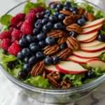 A vibrant and refreshing Mixed Green Salad with Berries, combining fresh mixed greens, assorted berries, crisp apple, candied pecans, and creamy feta cheese topped with a luscious homemade creamy poppy seed dressing. This salad offers a perfect balance of sweet, tangy, and crunchy textures, making it ideal for a light lunch or elegant side dish.