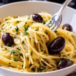 A simple and flavorful pasta dish featuring penne or fusilli tossed with sautéed olives, garlic, and cherry tomatoes, finished with fresh basil and Parmesan cheese. Perfect for a quick and satisfying meal.