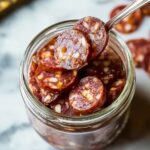 While the brine simmers, slice your smoked sausages into bite-sized pieces — the perfect size for snacking or adding to other dishes. Placing them in a clean glass jar ensures that they’re ready to soak up the flavorful liquid.