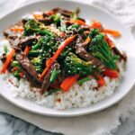 A quick and flavorful beef stir-fry perfect for a weeknight dinner. Tender slices of beef are marinated in a savory sauce, then stir-fried with fresh vegetables like bell pepper, broccoli, and carrot. Finished with garlic, ginger, and a drizzle of sesame oil, this dish is served hot over steamed white rice for a satisfying Asian-inspired meal.