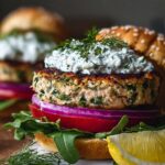 These Salmon Burgers with Tzatziki are a flavorful and healthy twist on the classic burger. Made with fresh skinless salmon fillets mixed with vibrant herbs and spices like parsley, coriander, sumac, and paprika, these patties are lightly breaded and pan-fried to golden perfection. Served on toasted buns with creamy tzatziki sauce, crisp baby arugula, tomato, and red onion, these burgers offer a delicious balance of fresh flavors and satisfying textures perfect for a quick weeknight dinner or casual get-together.