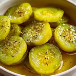 These Savory Southern-Style Pickled Green Tomatoes offer a tangy and slightly spicy twist on a classic Southern favorite. Perfectly sliced and soaked in a flavorful brine of vinegar, sugar, sea salt, and aromatic seeds, these pickles add a delightful crunch and zest to sandwiches, salads, or snacks. Ready in just over 24 hours and with minimal cooking, they bring a burst of freshness and tradition to your table.