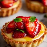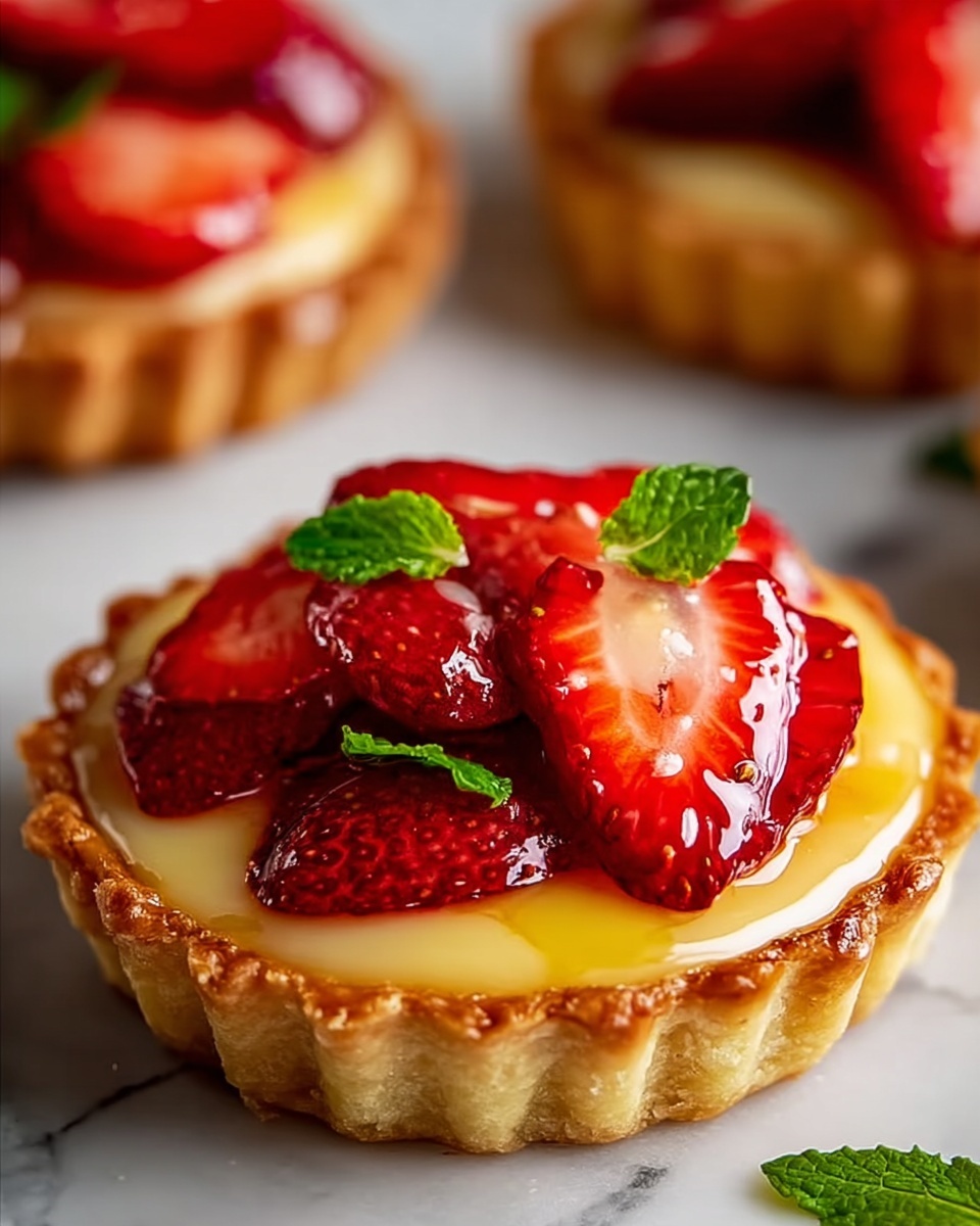 Fresh strawberries sliced thinly are the star garnish, lending their natural sweetness and visual appeal. A sprinkle of powdered sugar or a few fresh mint leaves not only add a pop of color but also a refreshing aroma that complements the custard’s honeyed richness and the bright lemon curd. These small touches make every tart feel elegantly finished and irresistible.