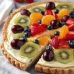 This Sugar Cookie Fruit Pizza features a soft and chewy sugar cookie crust topped with a creamy vanilla-infused cream cheese frosting and an assortment of fresh, colorful fruits. Perfect for summer gatherings or as a delightful dessert, this recipe combines sweet, tangy, and buttery flavors with a vibrant presentation.