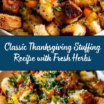 This Thanksgiving Stuffing Recipe features a savory blend of toasted bread, sautéed onion and celery, fresh herbs, and a flavorful broth and egg mixture. Baked to a perfect crispy top and tender interior, this classic side dish is a must-have for your holiday feast.