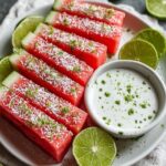 Enjoy a refreshing and unique snack with these Watermelon Fries paired perfectly with a tangy Coconut Lime Dip. This no-cook recipe combines the sweet juiciness of watermelon with the zesty twist of Tajin seasoning and a creamy, citrusy coconut yogurt dip that’s sure to delight your taste buds during warm weather or as a fun appetizer.